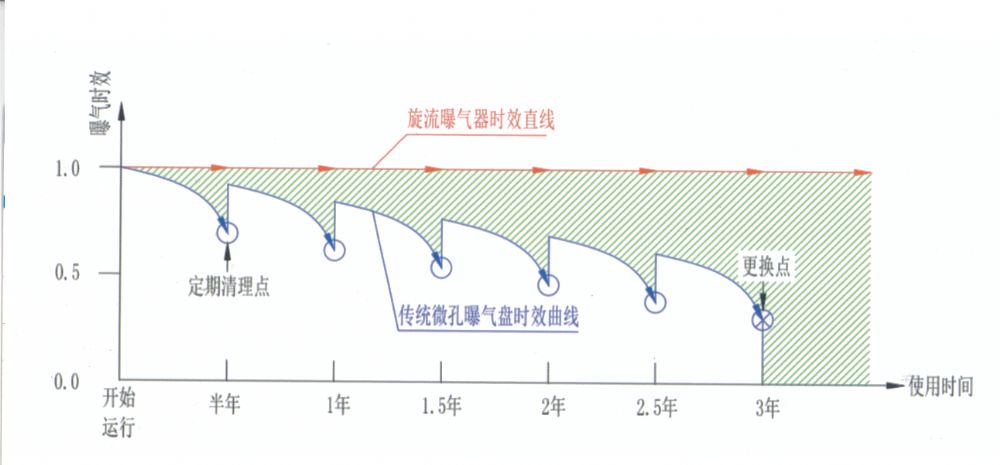 從上圖可以看出,旋流式曝氣器在污水中曝氣效率始終不變,而傳統(tǒng)微孔曝氣隨著使用時間的延長,其曝氣效率是遞減的,而且到達(dá)使用年限必須更換。